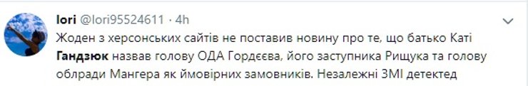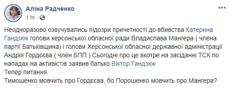 "Я знаю только одно: когда организатор убийства сотрудничает с главой Херсонского областного совета, членом партии "Батькивщина" Владиславом Мангером. Когда уголовный авторитет тесно сотрудничает с председателем Херсонской областной государственной администрации, партийцем Блока Петра Порошенко Андреем Гордеевым. Когда уголовный авторитет тесно сотрудничает с заместителем Гордеева Евгением Рищуком – эти люди должны исчезнуть с политического горизонта. Они скомпрометированы навсегда", – заявил Гандзюк.