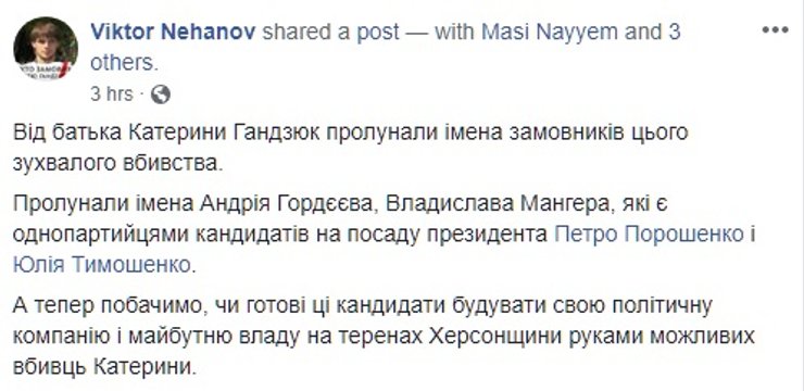 Виктор Гандзюк призвал Петра Порошенко и Юлию Тимошенко "не идти на выборы в крови" и порвать все связи с лицами, которые могут быть причастны к убийству его дочери. В соцсетях его заявление осталось незамеченным топовыми блогерами, но все равно вызвало резонанс