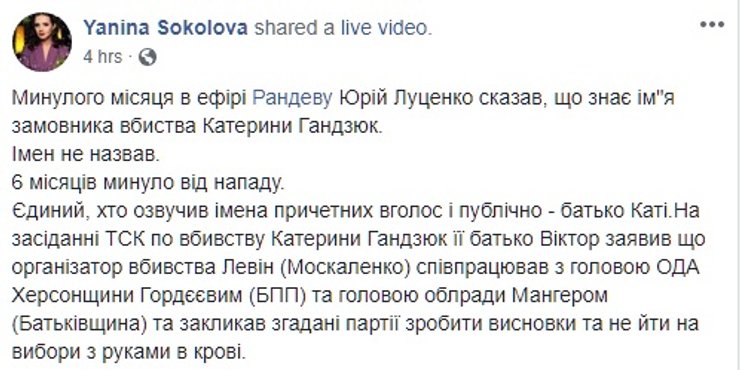 3 декабря генеральный прокурор Юрий Луценко заявил, что следствие установило всех заказчиков убийства Гандзюк.