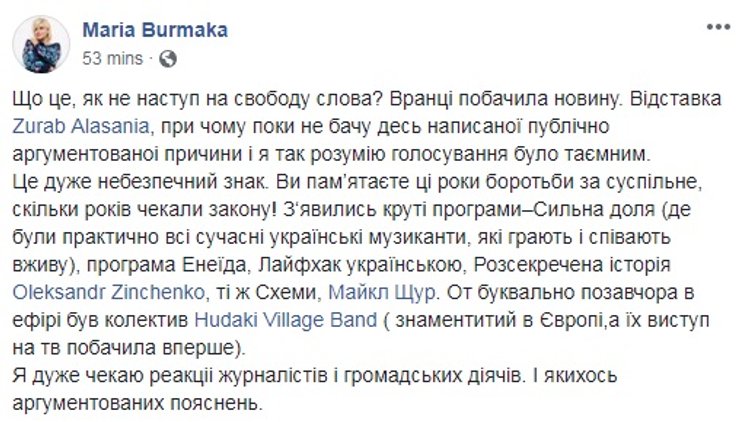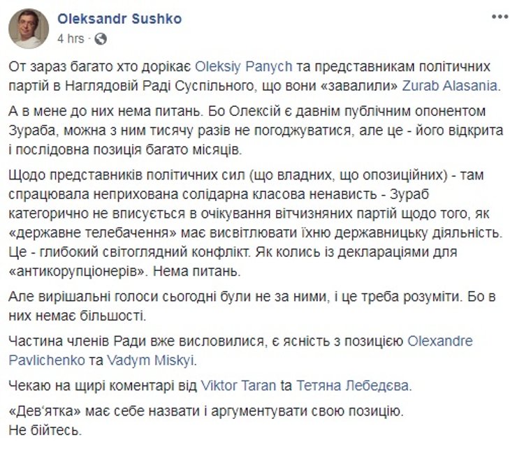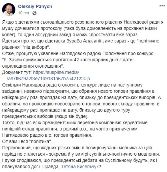 В протоколе скандального заседания Набсовета, выдержку из которого опубликовал Аласания на своей странице в Facebook, написано, что канал не осветил ряд "важных событий" (во всех из них принимал участие президент Петр Порошенко), а его руководство неправильно поняло принцип "отстранения от власти", что привело "к полной деполитизации новостей" и "прямо противоречит миссии НОТУ – "предоставлять достоверную и сбалансированную информацию об Украине и мире".