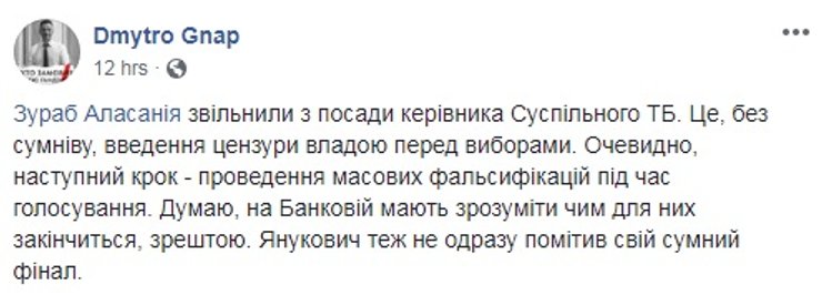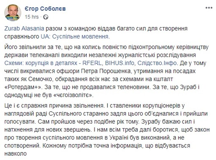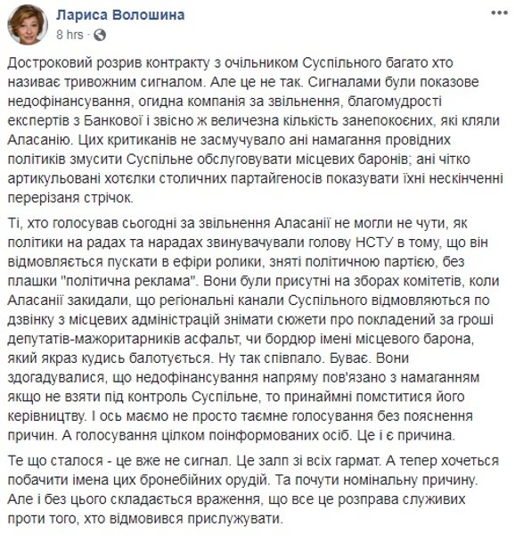 Позже Аласания уточнил, что его увольнение инициировали члены Набсовета, связанные с "партией власти". И добавил, что самые серьезные скандалы в последнее время происходили из-за расследований журналистов программ "Схемы", "Наші гроші", а также из-за невозможности контролировать наполняемость выпусков новостей на Общественном.