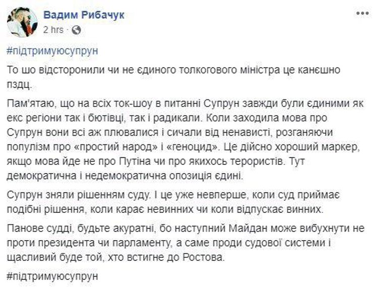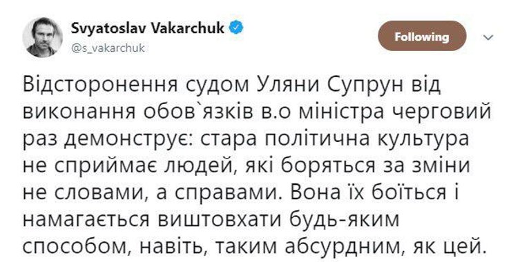 В частности, вице-премьер Павел Розенко заявил об отсутствии юридических оснований для отстранения Супрун от должности и.о. министра. Также в Кабмине пообещали обжаловать решение суда и добиваться его отмены в установленном законом порядке.