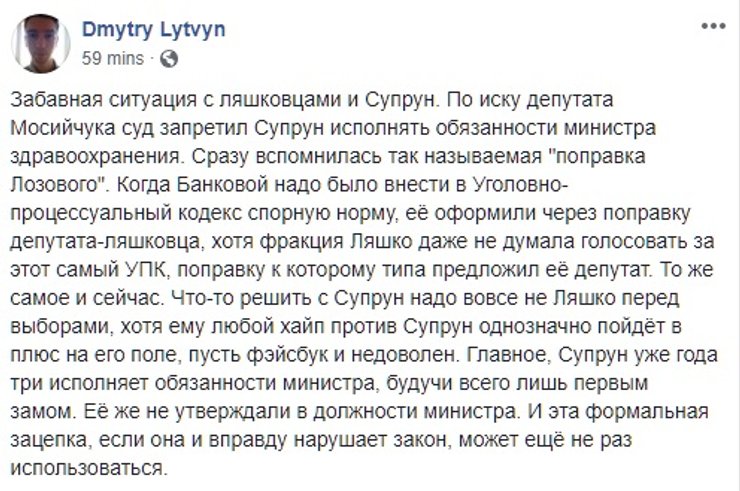 Решение было принято по иску нардепа от Радикальной партии Игоря Мосийчука. Парламентарий просил признать отсутствие у Супрун полномочий исполнять обязанности главы Минздрава, "поскольку ее назначение на указанную должность в установленном порядке компетентным органом осуществлено не было".