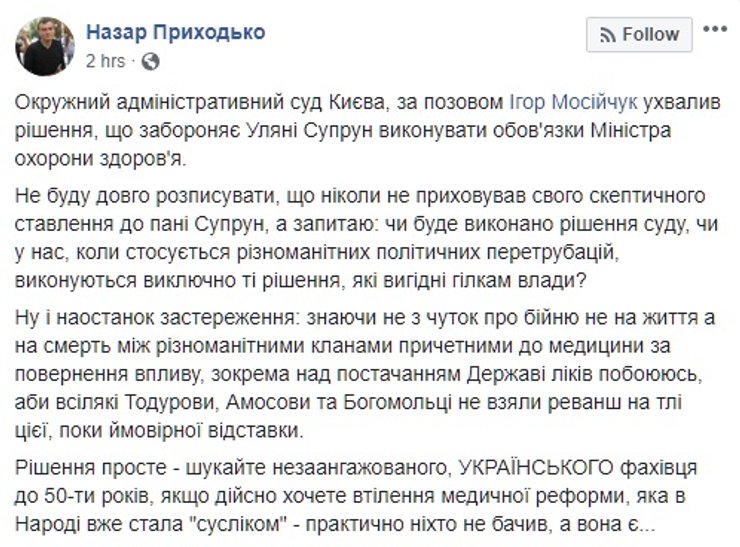 Окружной административный суд Киева вынес решение по иску нардепа Игоря Мосийчука против и.о. министра здравоохранения. Его одобрили далеко не все