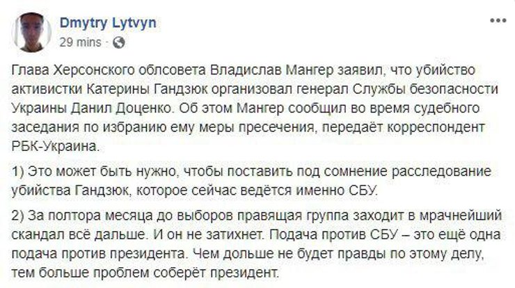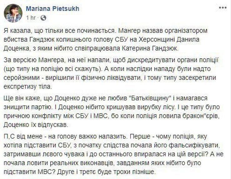 "Я считаю, что Доценко организовал нападение на Екатерину Гандзюк с целью дискредитации органов полиции. У нас есть неопровержимые доказательства этого. После того, как нападение привело к тяжелым последствиям, произошло физическое уничтожение Екатерины и использование этой страшной трагедии в политических целях", – заявил Мангер.