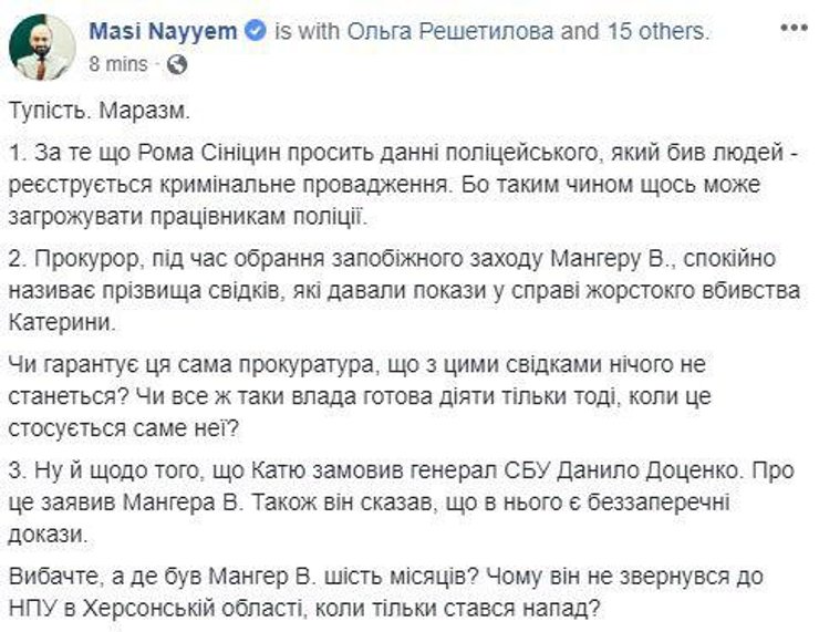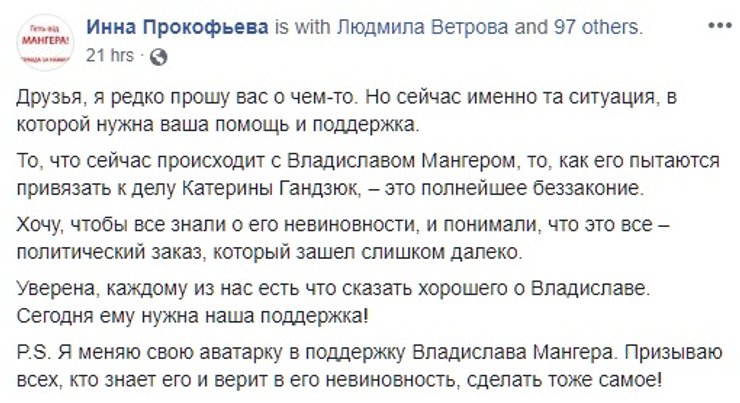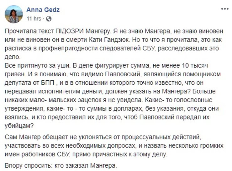Обратили внимание пользователи и на то, что в предъявленном Мангеру подозрении не указаны конкретные доказательства его причастности к убийству Гандзюк. А некоторые вообще не поверили, что он мог пойти на такое преступление.