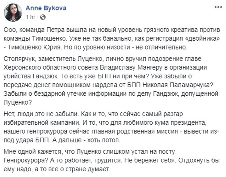 Одновременно с появлением нового подозреваемого дело Гандзюк получило и новую политическую окраску. В соцсетях сразу появились посты и комментарии с акцентом на еще недавнем членстве Мангера в "Батькивщине". Пользователи задались вопросом, знала ли лидер партии Юлия Тимошенко о его возможной причастности к убийству, а также упрекнули ее в подборе в свою команду "сомнительных" кадров.