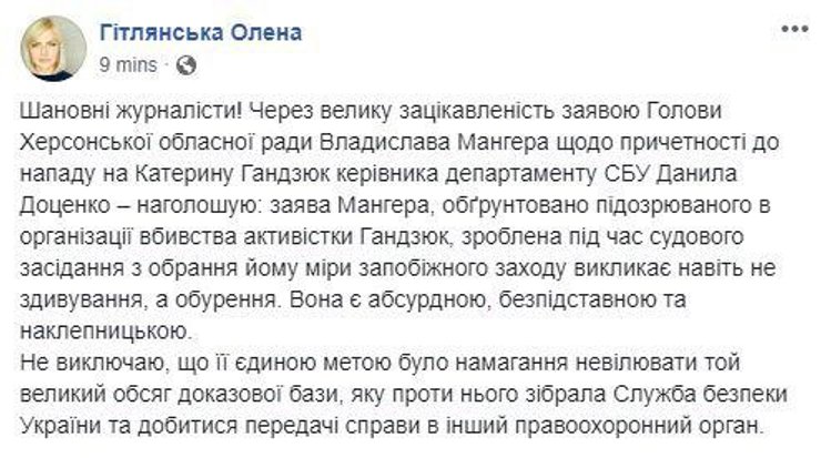 28 января отец Екатерины Виктор Гандзюк на заседании Временной следственной комиссии Верховной Рады прямо заявил, что Мангер, а также председатель Херсонской обладминистрации Андрей Гордеев (член "БПП") и его заместитель Евгений Рыщук причастны к убийству его дочери.