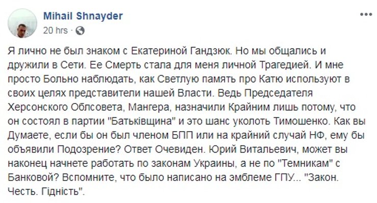 Также пользователи напомнили, что Мангер – это только один из руководителей Херсонской области, который, по мнению друзей и родственников Гандзюк, может быть причастен к ее убийству, а к другим у следствия претензий нет.