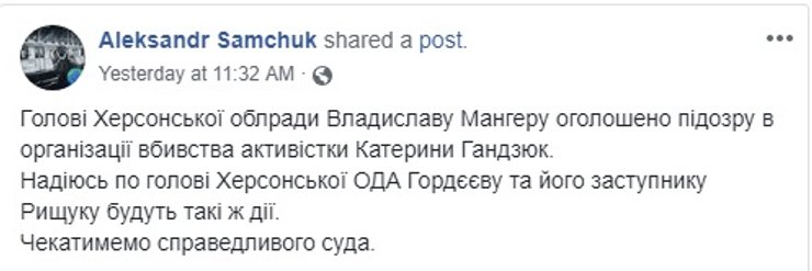 11 февраля председателю Херсонского областного совета Владиславу Мангеру официально сообщили о подозрении в организации убийства активистки Екатерины Гандзюк.