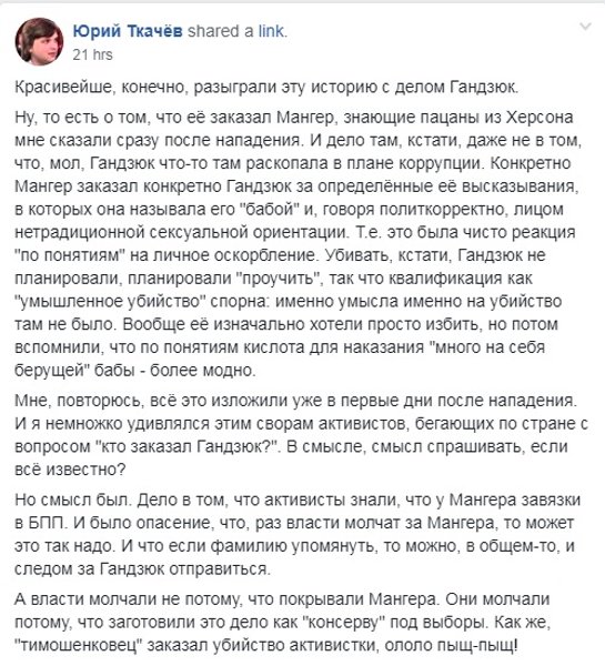 Друзья Гандзюк называют Мангера ее "врагом №1" и утверждают, что она ушла из "Батькивщины" после того, как его выдвинули кандидатом от партии на прошлых парламентских выборах. По словам знакомых погибшей активистки, она неоднократно указывала на связи Мангера с криминалитетом и называла его организатором херсонского "антимайдана".