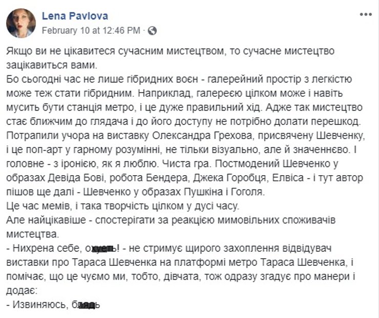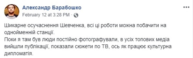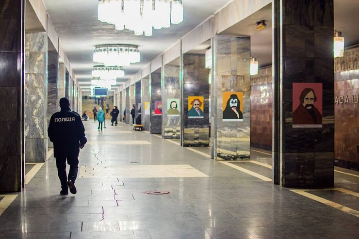 Выставка под названием "Проект "Квантовый скачок Шевченко" открылась 10 февраля на станции метро "Тараса Шевченко". И должна была действовать до 10 марта. Увидеть ее мог каждый, кто, собственно, купил билет в метро. Организаторами выставки выступили Национальный музей Шевченко и "Киевский метрополитен", а автором работ стал художник Александр Грехов.