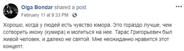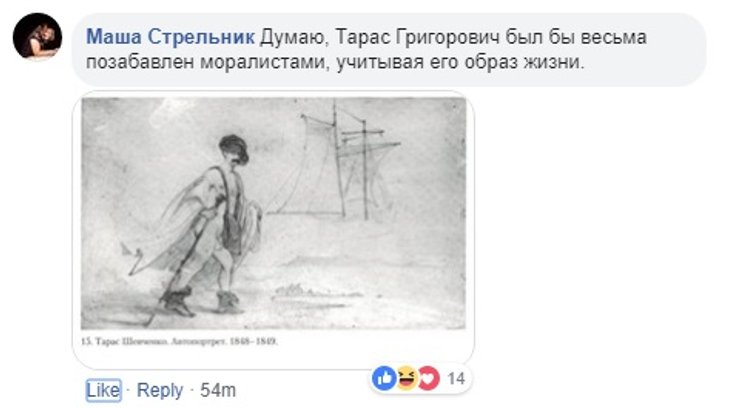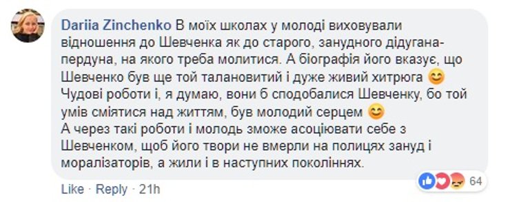 Но такая позиция оказалась отнюдь не доминирующей. Многие пользователи предположили, что будь Тарас Григорьевич жив, он бы оценил по достоинству свою популярность. И добавили, что нужно избавляться от придуманного в советское время "депрессивного" образа Шевченко с усами и кожухе. Ведь великий поэт вел активный образ жизни и любил посмеяться над самим собой. А новые образы как раз и призваны его осовременить и сблизить с молодежью.