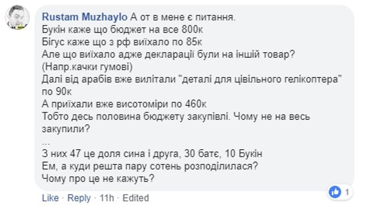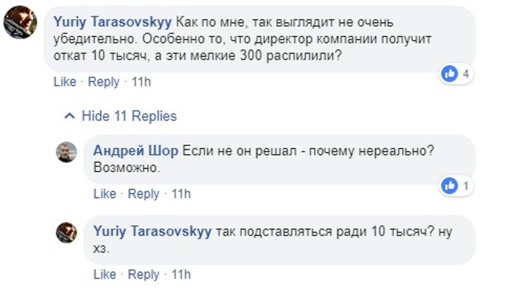 Вопросы вызвали и распределение прибыли и откатов в схеме, которую расследовали журналисты. Пользователи соцсетей не поняли, почему нынешнему главе Укроборонпрома досталось всего 10 тыс. долларов, и на что ушла остальная часть "накрутки".