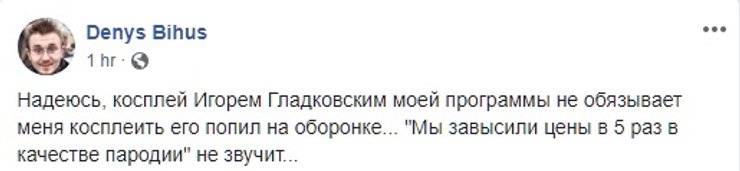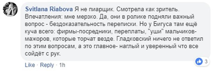 Гладковский-младший отреагировал на журналистское расследование более креативно. Кроме подачи иска в суд против Дениса Бигуса и Леси Ивановой он дебютировал в соцсетях со своим собственным видеороликом. Игорь Гладковский "скосплеил" Дениса Бигуса из первой двух частей: рубашка, очки, манера изъясняться. И попытался наглядно продемонстрировать, что обвинения журналистов BIHUS.info беспочвенны.