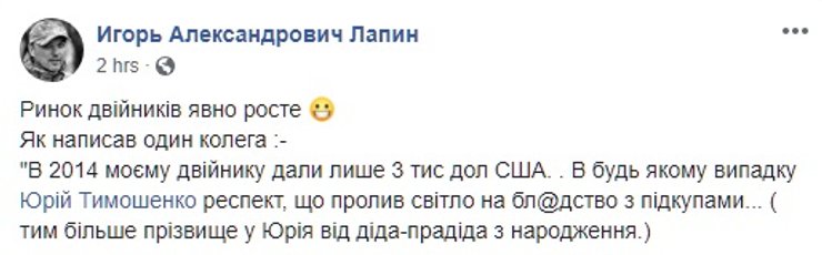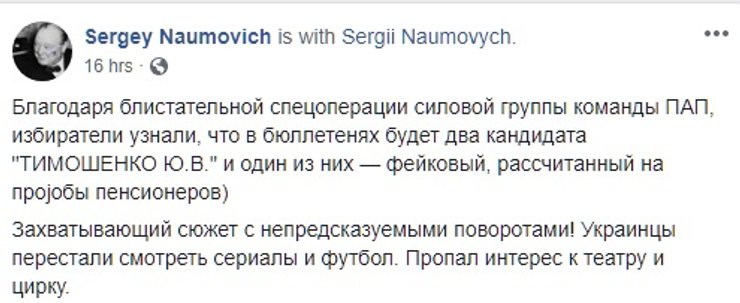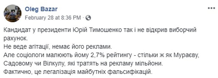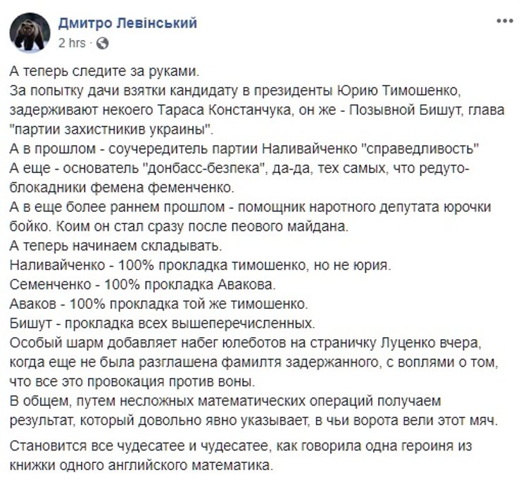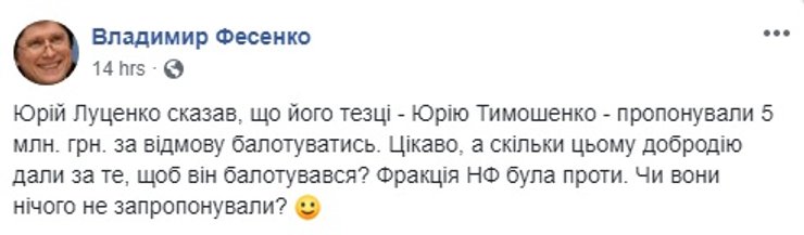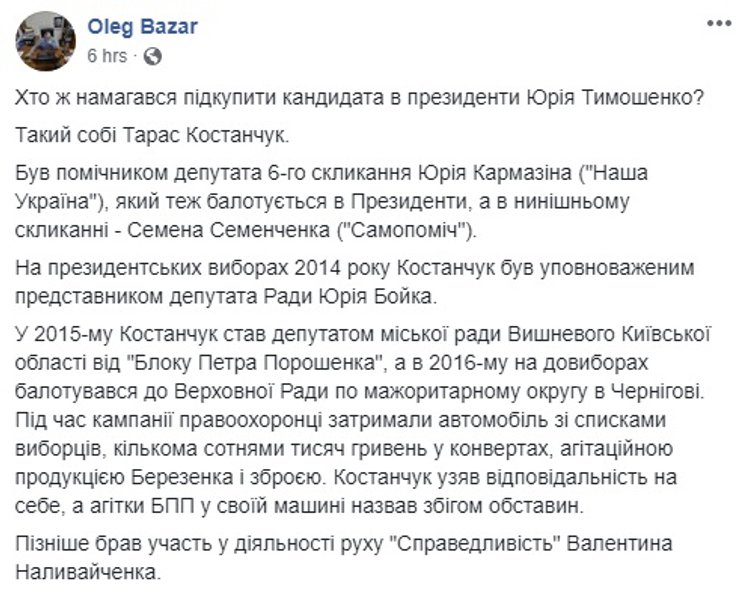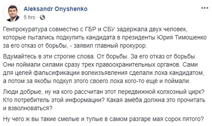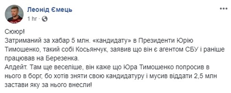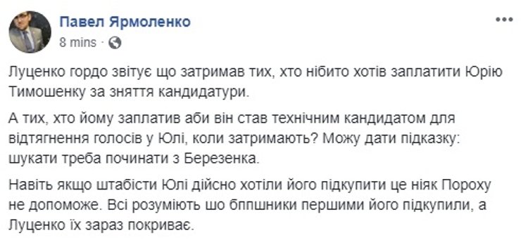 6 марта Генпрокуратура провела задержание двух мужчин, которые якобы пытались подкупить кандидата в президенты Юрия Тимошенко. Сообщение об этом опубликовал генпрокурор Юрий Луценко.