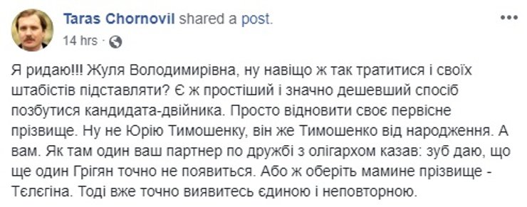 Также многие вспомнили, что Юрий Тимошенко свои имя и фамилию носит с рождения, тогда как Юлия Тимошенко в силу обстоятельств несколько раз меняла фамилию.
