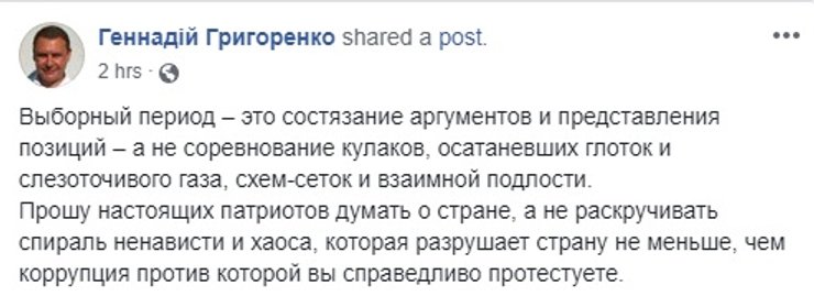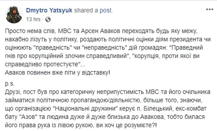 Министр внутренний дел на стычки в Черкассах отреагировал философским постом.