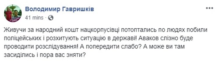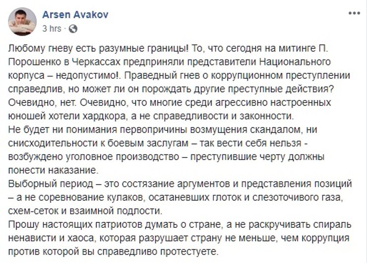 Однако, сочувствия не получил. Многие пользователи соцсетей уверены, что организации "Национальный корпус" и "Национальные дружины" имеют к Авакову самое прямое отношение, а, значит, драки в Киеве и Черкассах можно было остановить еще в зародыше.