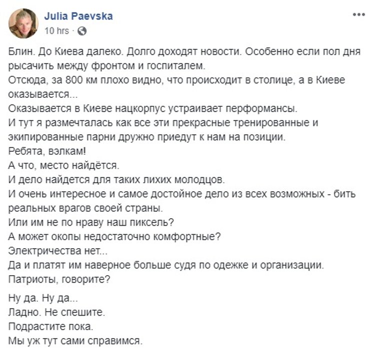 Сведения о том, что случилось дальше - расходятся. Нацкорпус и нацдружины утверждают, что президент от них "сбежал", а они прорвались на сцену, где один из участников акции толкнул короткую, но вдохновляющую речь.
