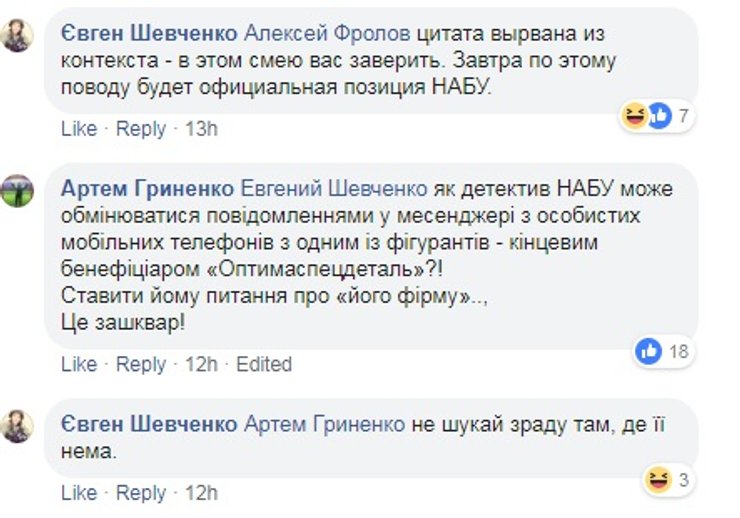 В расследовании также говорится, что о махинациях знало и НАБУ. В 2016 году Бюро передало в Укроборонпром перечень фиктивных фирм, к числу которых отнесло Оптимумспецдеталь. Но позже компанию вычеркнули из списка. В роли посредника при решении проблем в этому случае якобы выступал "тайный агент" Евгений Шевченко (на прошлой неделе директор НАБУ Артем Сытник заявил, что Шевченко никогда не был сотрудником Бюро, но сотрудничал с детективами по ряду уголовных производств).