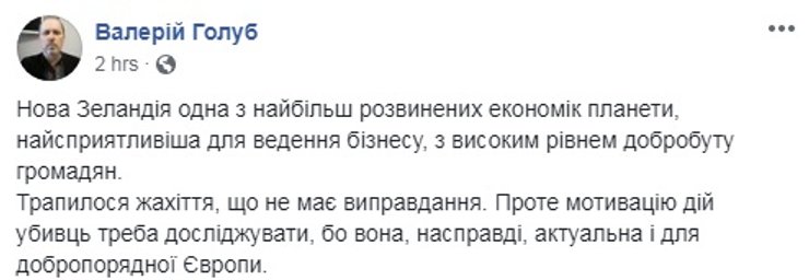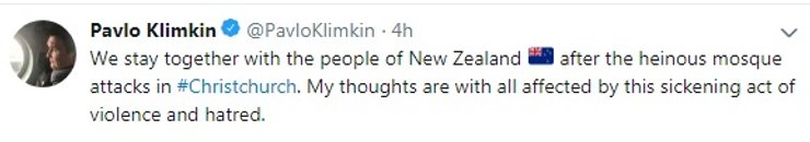 Перевод: мы поддерживаем народ Новой Зеландии после ужасной атаки на мечеть в Кристчерч. Я мысленно с каждым, кто пострадал от этого безумного акта ненависти и насилия.