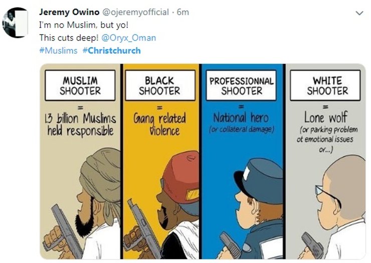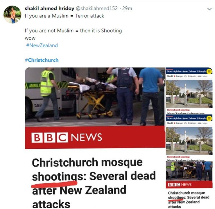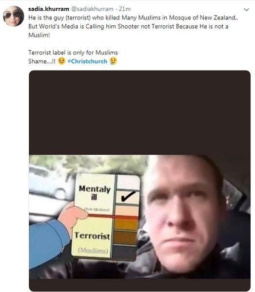 Перевод: этот парень (тероррист) убил множество мусульман в мечети в Новой Зеландии, но мировые СМИ называют его стрелком, не терорристом, потому что он не мусульманин! Ярлык "тероррист" только для мусульман!