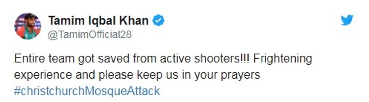 Твит от члена команды по крикету: только что спаслись от стрелка!!! Это ужасно, молитесь за нас
