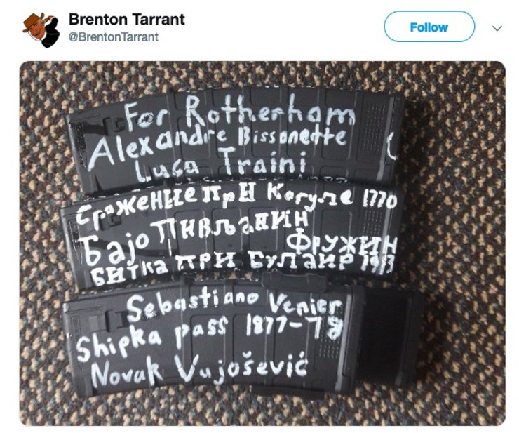 К теракту стрелок из Кристчерч подготовился основательно. Видимо, он изначально планировал, что будет вести стрим, поэтому продумал все детали: музыка в машине по пути к мечетям (играл антиисламский гимн времен балканской войны) и расписанные цитатами и датами магазины для оружия и сама винтовка. В частности, на них упоминается Александр Биссонет, расстрелявший прихожан в мечети канадского Квебека в 2018 году и даже битва при Кагуле (русско-турецкая война, 1770 год). Брентон так отметил важных людей и важные даты, ставшие "ключевыми для становления европейской цивилизации".