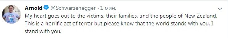 Твит от Арнольда Шварценеггера: мое сердце с жертвами, их семьями и новозеландцами, это ужасный акт тероризма, но знайте, что мир поддерживает вас. Я поддерживаю вас.