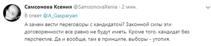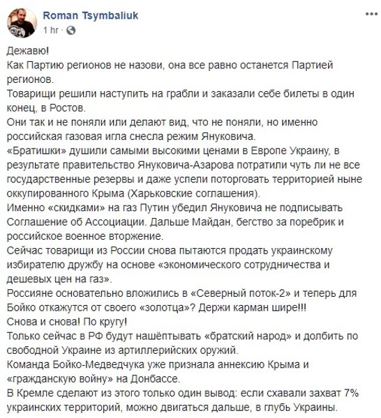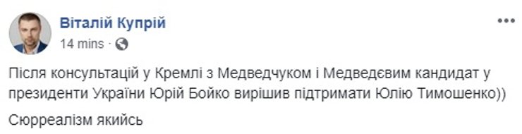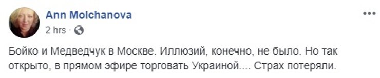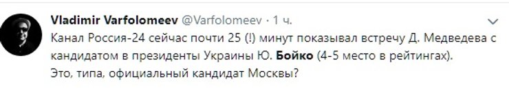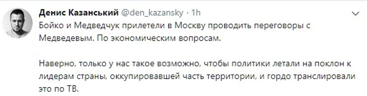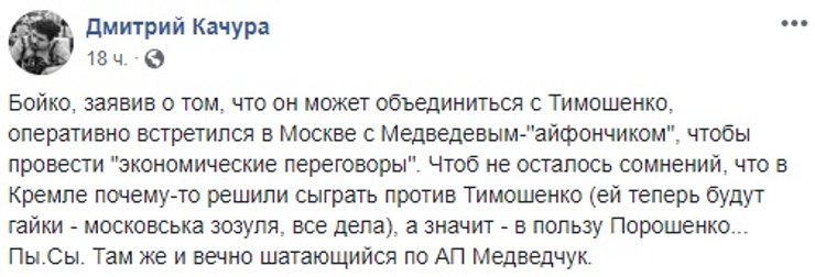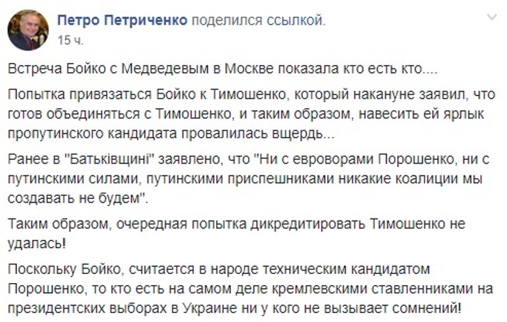 Стоит добавить, что часть пользователей соцсетей увидели во вчерашнем визите лидеров "Оппозиционной платформы" доказательство того, что и Юлия Тимошенко -- пророссийский кандидат. Вероятно, исходя из принципа "Хто всрався? Невістка". Дело в том, что накануне поездки в Москву Бойко в эфире телеканала NewsOne на вопрос телеведущей, возможно ли его объединение в будущем с лидером "Батькивщины", ответил: "Если будет посыл к миру, то да". У Тимошенко сразу заявили, что на такой союз никогда не пойдут. Это однако не помешало ее противникам эту тему подхватить и развивать, не обращая никакого внимания на хронологию событий.