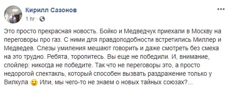 Обсудили в соцсетях и заявленную тему переговоров в Горках. Включился в обсуждение и Нафтогаз. В компании напомнили, что по решению Стокгольмского арбитража цена на газ уже должна быть ниже на 48% и поинтересовались, как Медведчук будет выбивать из российского монополиста миллиардные штрафы.