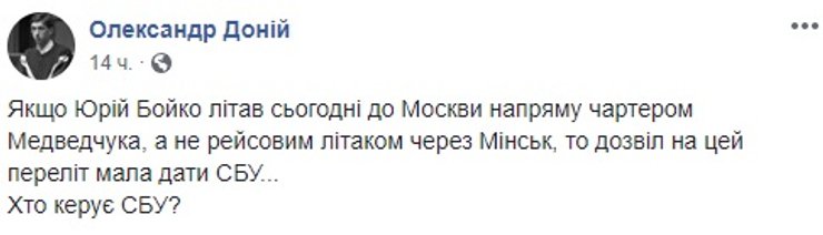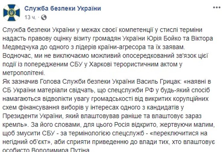 Многие пользователи не ограничились одним выражением недовольства и потребовали немедленной реакции СБУ и скорейшего наказания политиков, совершивших поездку в Москву. Служба безопасности на такие просьбы отреагировала и сообщила, что в сжатые сроки даст правовую оценку встрече Бойко и Медведчука с руководством страны-агрессора. Одновременно в спецслужбе выдвинули весьма интригующую версию о том, что эти события возможно "связаны с предупрежденным терактом в харьковском метрополитене". И добавили, что спецслужбы РФ любым способом пытаются отвлечь внимание общественности и СБУ от раскрытых спецслужбами схем финансирования "одного из кандидатов", который устраивает Кремль и лично Владимира Путина.