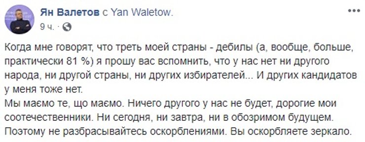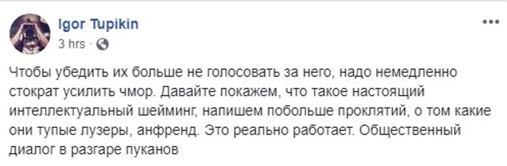 При этом отметим, что в данном вопросе наибольшую активность проявили сторонники действующего президента, которые высокий результат Зеленского сразу заклеймили "реваншем ваты", "победой Коломойского" и низким самосознанием украинцев.