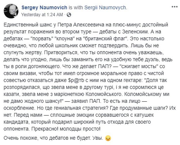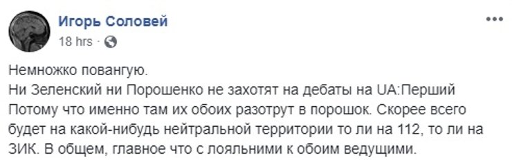 Впрочем, многие пользователи сомневаются, что кандидаты придут на дебаты. В первую очередь такие опасения высказываются о Зеленском. Тем более, что он уже неоднократно в последний момент отменял свои встречи с журналистами. Одновременно звучат и предположения, что если ведущий будет задавать объективные вопросы, то достанется обоим кандидатам.