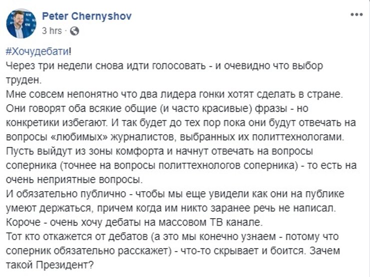 Тем временем на сайте Администрации президента создали петицию с требованием обязательно провести публичные дебаты (сейчас она уже собрала 4877 подписей из 25 000 необходимых), а соцсетях запустили флешмоб #ХочуБачитиДебати.