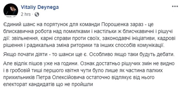 Уже на следующий день один из штабистов шоумена Руслан Рябошапка заявил, что не видит смысла "начинать эти, извините за грубое слово, собачьи бои, когда люди устраивают ток-шоу, а не дискуссию или обмен мнениями относительно программ".