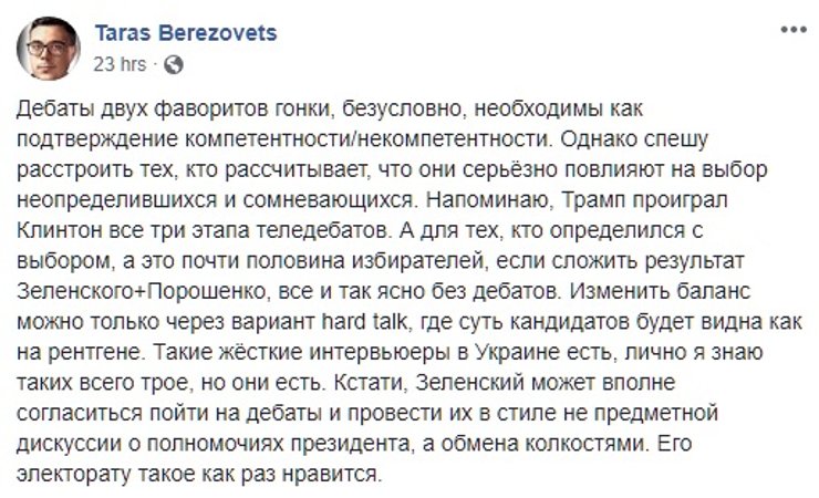 При этом шоумен опережает своего визави с почти двухкратным перевесом. В штабе Порошенко увидели возможность для сокращения отрыва в проведении теледебатов, на которых нынешний гарант сможет показать свои сильные стороны над неопытным в политических делах конкурентом. Тем более, что запрос на дебаты есть и в обществе.