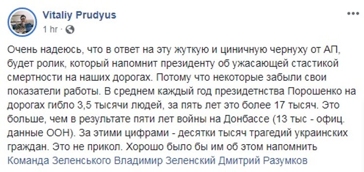В оригинальном предвыборном ролике Владимир Зеленский ведет за собой народ в "светлое будущее",  в пародии, которую якобы запустили в сеть сторонники Порошенко, шоумена сбивает самосвал. В соцсетях видео вызвало неоднозначную реакцию, а МВД начало расследование по ст. 346 Уголовного кодекса (угроза или насилие в отношении государственного или общественного деятеля) ст. 346 © Офіційний сайт Національної поліції: https://www.npu.gov.ua/news/vibori/za-faktom-rozpovsyudzhennya-videorolika-za-uchasti-kandidata-v-prezidenti-vidkrito-kriminalne-provadzhennya/ ст. 346 © Офіційний сайт Національної поліції: https://www.npu.gov.ua/news/vibori/za-faktom-rozpovsyudzhennya-videorolika-za-uchasti-kandidata-v-prezidenti-vidkrito-kriminalne-provadzhennya/ ст. 346 © Офіційний сайт Національної поліції: https://www.npu.gov.ua/news/vibori/za-faktom-rozpovsyudzhennya-videorolika-za-uchasti-kandidata-v-prezidenti-vidkrito-kriminalne-provadzhennya/ ст. 346 © Офіційний сайт Національної поліції: https://www.npu.gov.ua/news/vibori/za-faktom-rozpovsyudzhennya-videorolika-za-uchasti-kandidata-v-prezidenti-vidkrito-kriminalne-provadzhennya/ ст. 346 © Офіційний сайт Національної поліції: https://www.npu.gov.ua/news/vibori/za-faktom-rozpovsyudzhennya-videorolika-za-uchasti-kandidata-v-prezidenti-vidkrito-kriminalne-provadzhennya/