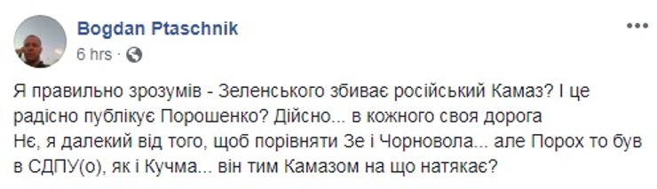 По утверждению штаба Зеленского, канал "Европейское будущее Украины", где появился ролик с грузовиком, является официальным Telegram-каналом действующего президента. Стоит отметить, что прямых подтверждений этому нет, однако на канале периодически публикуются материалы в поддержку действующего президента, а на официальном Telegram-канале Порошенко ролик опубликован не был.