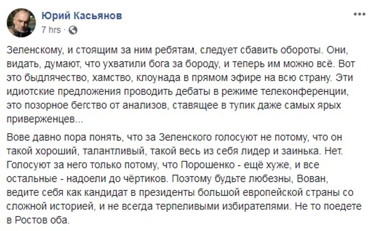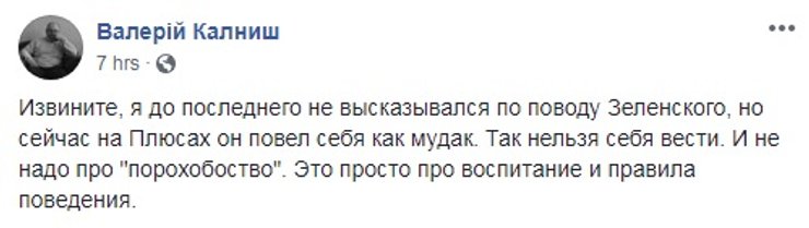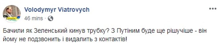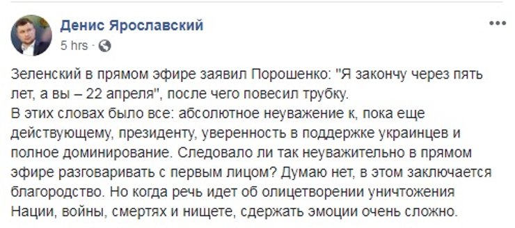 Другая часть пользователей решила, что начинающий политик поступил правильно, потому что время для длинных диалогов и пространных рассуждений прошло, а свою эмоциональность кандидат объяснил сам во время телефонного разговора. "Я попросил, чтобы меня называли Владимир Александрович. Не быдло, не наркоман и т.д. Но это немножечко продолжается", — сказал Зеленский Порошенко.