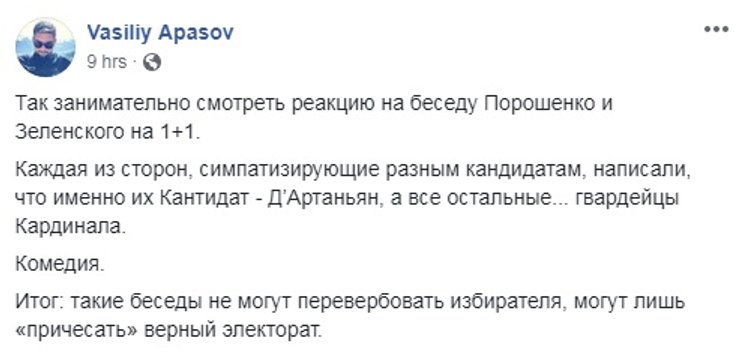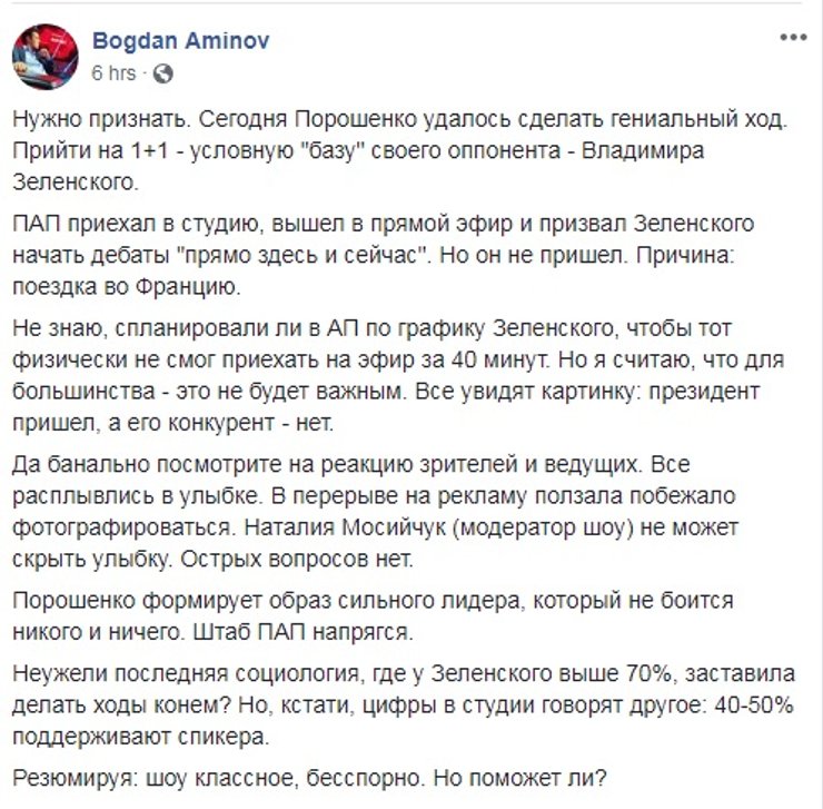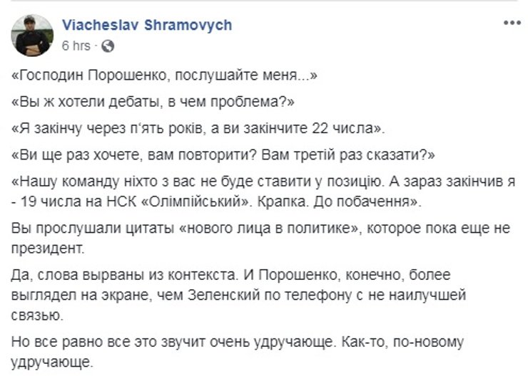 В соцсетях посчитали, что это была тренировка перед дебатами и они, похоже, получатся куда интересней, чем ожидалось. Если они, конечно, состоятся. Ясно, что Зеленский на дебатах будет вести себя именно так: стараться шокировать и вывести собеседника из зоны комфорта. А Порошенко в свою очередь будет упрямо гнуть свою линию, при случае вторгаясь в зону комфорта своего оппонента.