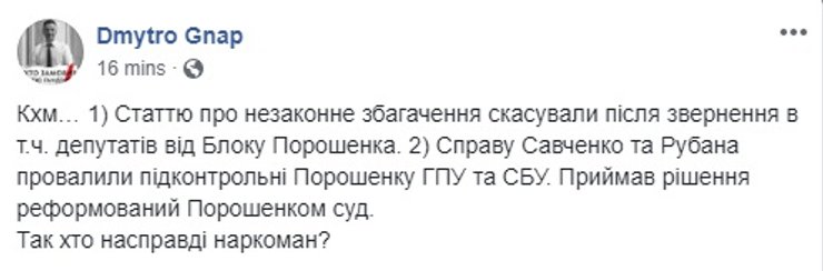 "ГПУ настаивает на достаточности доказательств Савченко и Рубана в совершении преступлений. Уверен, что завоз тяжелого оружия из так называемой ДНР для обстрела украинской столицы не останется безнаказанным", – написал он, добавив, что "судебная система тяжело больна".