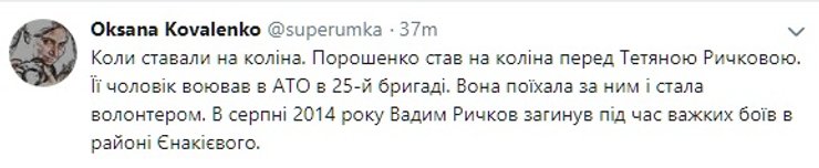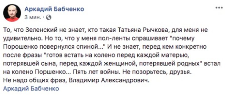 Также вышла неувязка со вставанием на колени. Зеленский стал лицом к собравшимся, Порошенко — лицом к Татьяне Рычковой, потерявшей мужа в АТО. Показалось, что президент повернулся спиной к публике, но ситуацию потом разъяснили.