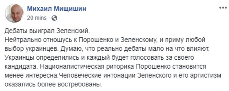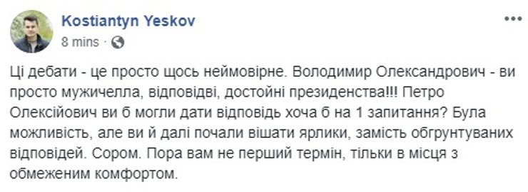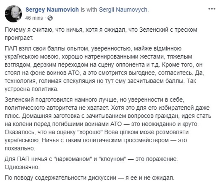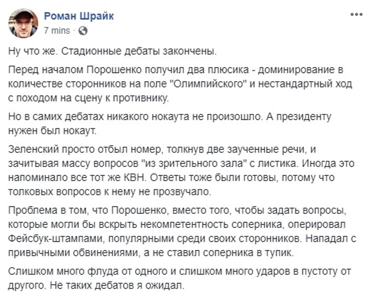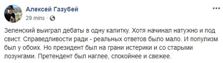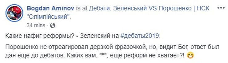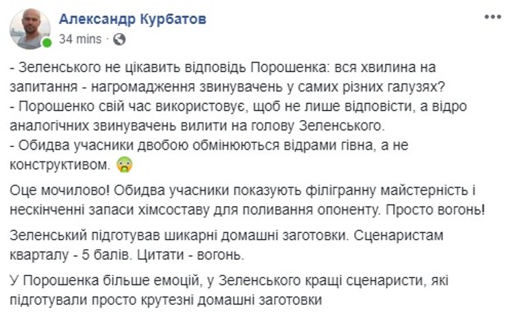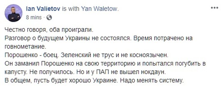 Некоторые даже попытались оценить, на чьей стороне поля оказался гипотетический мяч. Сторонники действующего президента ожидаемо решили, что Порошенко переиграл Зеленского.