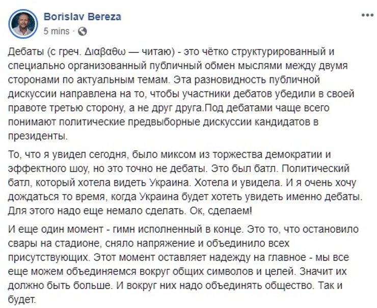 Дебаты длились час, как и было обещано. Оппоненты пытались нарушать регламент, обменивались оскорблениями, модераторы их осаживали, трибуны — освистывали. Зеленский признался, что он не политик, а простой человек, который пришел сломать систему. И заявил Порошенко, что в 2014 году поддерживал его, а теперь Зеленский — "результат ваших ошибок и обещаний". Порошенко в свою очередь назвал его "котом в мешке", на что Зеленский апеллировал, что лучше быть "котом в мешке, чем волком в овечьей шкуре".