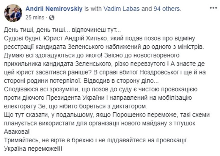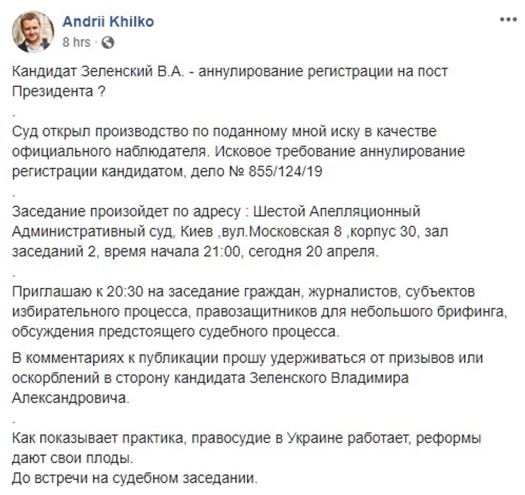День тишины перед вторым туром выборов президента Украины ознаменовался тем, что оказался совсем не тихим. В соцсетях обсуждали дебаты на Олимпийском, "повстанцев ДНР", жену Зеленского. Дело шло к вечеру, когда вдруг оказалось, что в Шестой апелляционный административный суд подан иск от наблюдателя на выборах от общественной организации "Украинская ассоциация акционеров" Андрея Хилько об отмене регистрации Владимира Зеленского кандидатом в президенты.