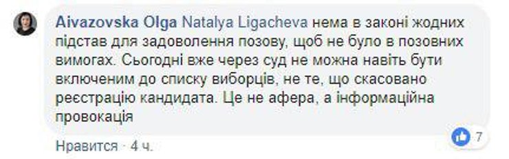 Ольга Айвазовская, председатель правления гражданской сети ОПОРА, которая наблюдает за выборами в Украине, заявляла, что "оснований для обжалования регистрации сейчас не может быть... Нет в законе никаких оснований для удовлетворения иска, чтобы не было (указано) в исковых требованиях. Сегодня уже через суд нельзя даже быть включенным в список избирателей, не то, чтобы отменять регистрацию кандидата. Это не афера, а информационная провокация", — сказала Айвазовская.