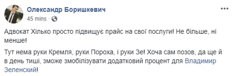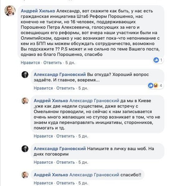 Хотя надо отметить, что 15 апреля Хилько якобы предлагал свою помощь народному депутату от БПП Александру Грановскому в комментариях под его публикацией в Facebook. Правда неясно, связывались ли они позже, или дело закончилось обменом комментариями.