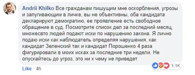 Главный юрист предвыборного штаба Владимира Зеленского Вадим Галайчук со своей стороны отмечал, что иск не имеет никакой перспективы и является абсолютно безосновательным. Тем более, что Андрей Хилько уже подавал несколько загадочных исков. Например, о том, что встреча Владимира Зеленского с президентом Франции Эммануэлем Макроном якобы была незаконной "предвыборной агитацией".